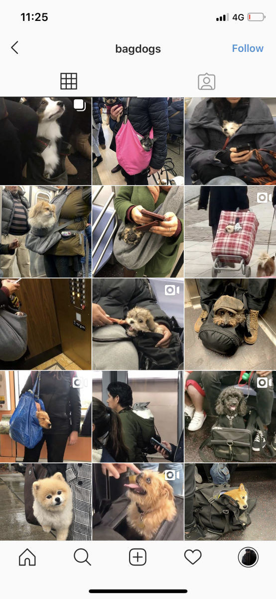 Picture 3: @bagdogs on Instagram (Combination of dogs in bags and the owner's hands, on their phone.)